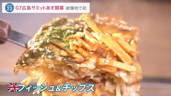 イギリスの“フィッシュ&チップス”をアレンジしたお好み焼きです。「ちんちくりん緑井店」では、G7参加国の食材や食文化を取り入れたお好み焼きを開発しました。