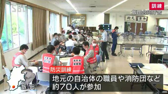 訓練は飯田合同庁舎で行われ、地元の自治体の職員や消防団などおよそ70人が参加しました。