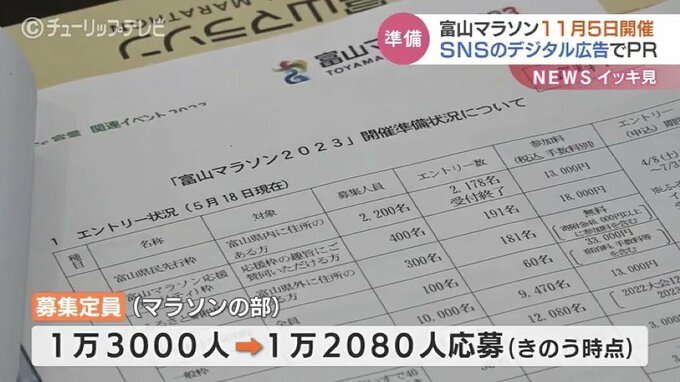 募集定員1万3000人に対し18日までに1万2080人がエントリーしていて、今年はSNS上のデジタル広告を活用して大会をPRします。富山マラソンは11月5日開催です。