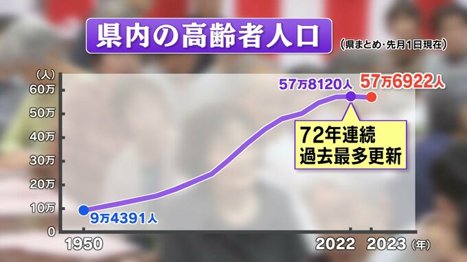 福島県のまとめによりますと、県内の65歳以上の高齢者の人口は、去年まで72年連続で過去最多を更新していました。今年4月1日現在は、57万6922人となっています。