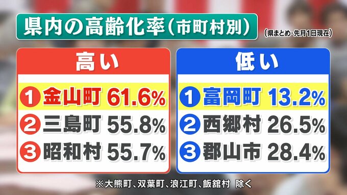 また、高齢化率を市町村別でみると、金山町が61.6%で最も高く、次いで三島町、昭和村となっています。