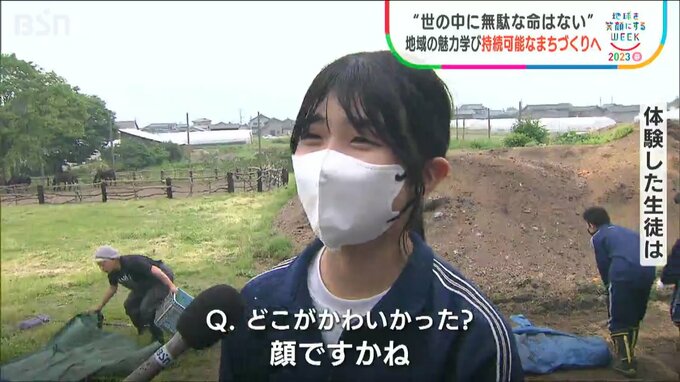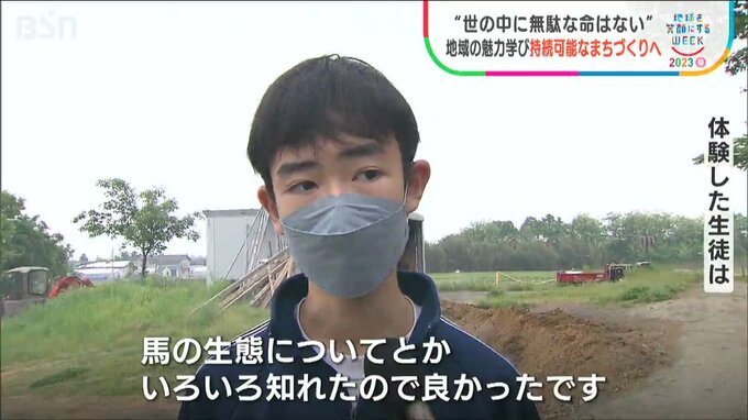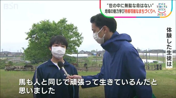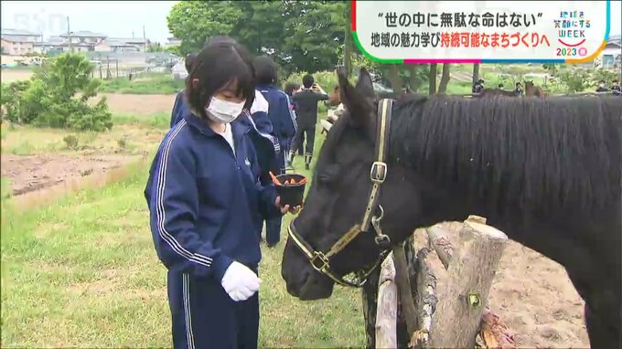 BSN では地球を笑顔にするウィークとして持続可能な社会への取り組みをお伝えしています。まずは新潟県胎内市の中学生の活動です。地域の魅力を再発見し、「持続可能なまち」について考えようと、牧場を見学したり馬の世話をしたりしました。