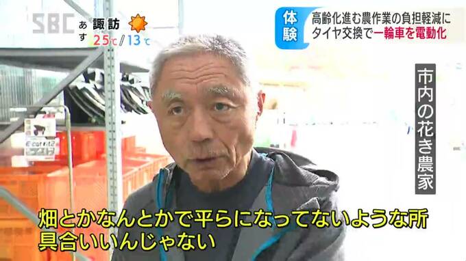 県内の農業従事者のうち高齢者の割合は73・5%と全国平均を上回っていて、会社では農家の負担軽減につながればと長野県で体験会を開きました。