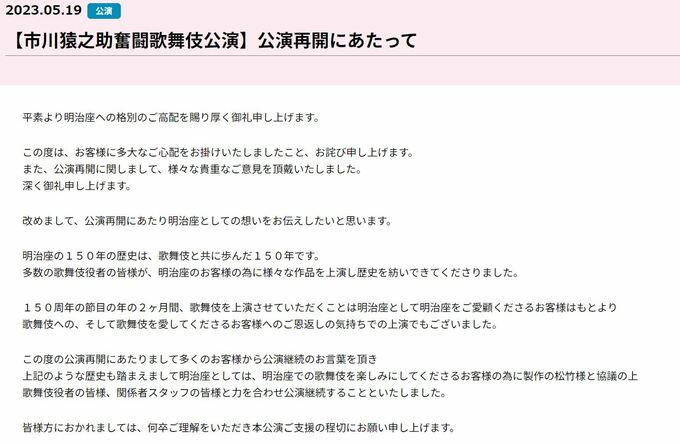 19日、明治座は一旦休演していた市川猿之助さんによる歌舞伎公演を、代役によって公演再開するにあたってコメントを発表しました。