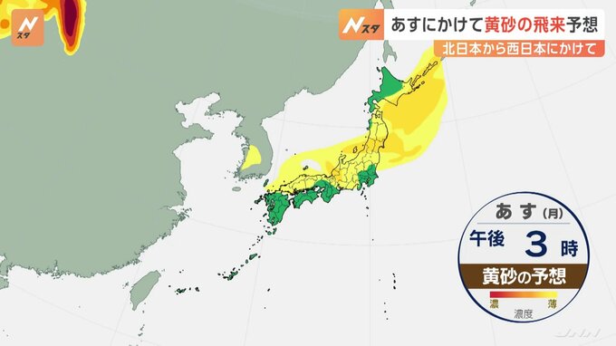 あすにかけて、北海道や東北、北陸、中国地方など、北日本から西日本の広い範囲で黄砂の飛来が予想されます。屋外では、ところによって黄砂が付着するなどの影響があるほか、水平方向で見通しの効く距離が5キロ未…