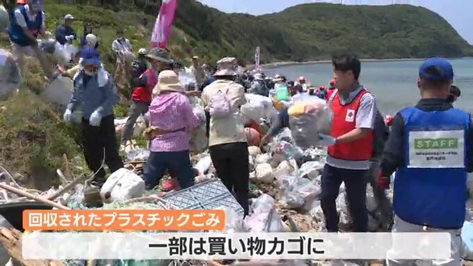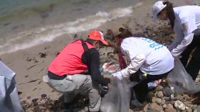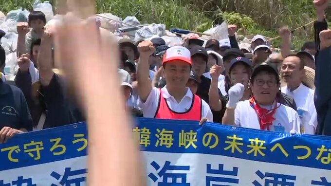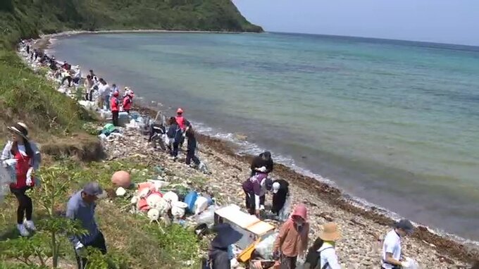 この取り組みは日本と韓国の交流事業の一環で、長門市の大浦海岸には県や市の呼びかけに応じた地元の企業やボランティアが集まりました。
