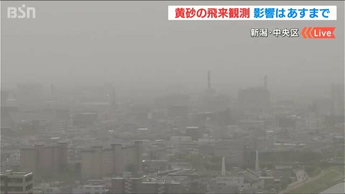 新潟県内で22日、黄砂の飛来が確認されました。新潟地方気象台ではマスクの着用や洗濯物の部屋干しなどを呼び掛けています。22日お昼頃、新潟市中央区でも空がかすんでいて、遠くの建物が見えづらくなっています。…