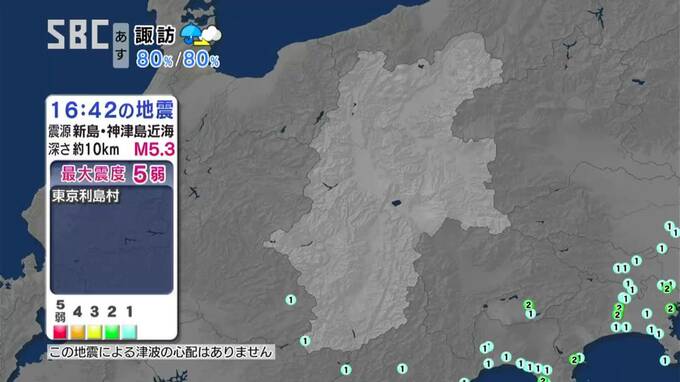 22日午後4時42分ごろ、東京都の新島と神津島の近海を震源とする震度5弱の地震があり、長野県内では根羽村で震度1を観測しました。