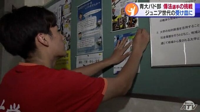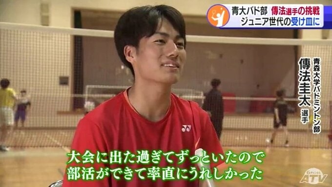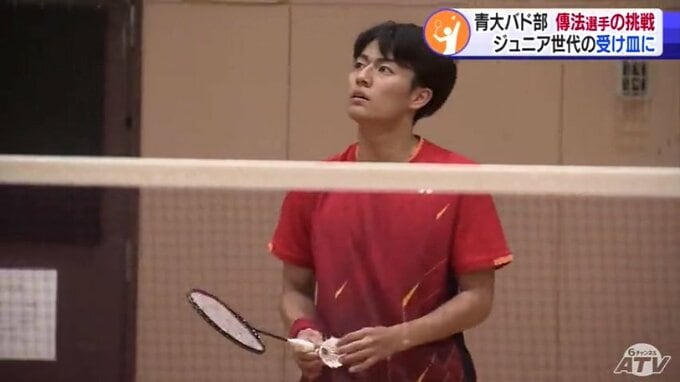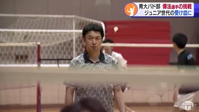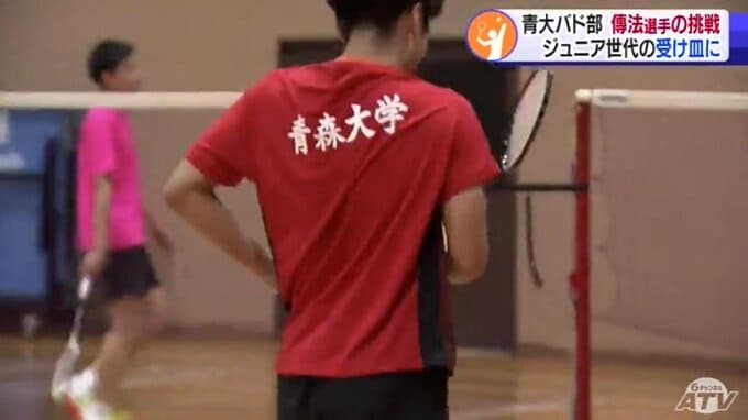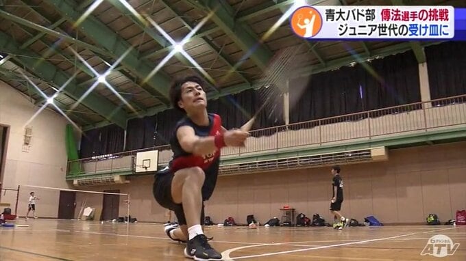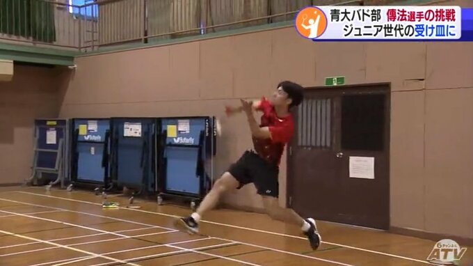 「青森大学」の文字が刻まれた真新しいユニホームが汗でぐっしょり濡れるほどのハードな練習に打ち込む傳法圭太選手。この春までチームメートだった青森山田高校の“後輩”とシャトルを打ち合います。