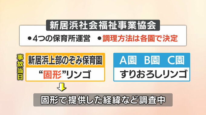 給食に使用する食材はいずれの園も同じですが、会見によりますと、調理方法などは各園で栄養士と調理師が相談して決めているということで、事故当日、他の3つの園ではすりおろしたリンゴを提供していたものの、新居浜上部のぞみ保育園だけは固形で食べさせていたということです。協会はその経緯などを調査中と説明しています。