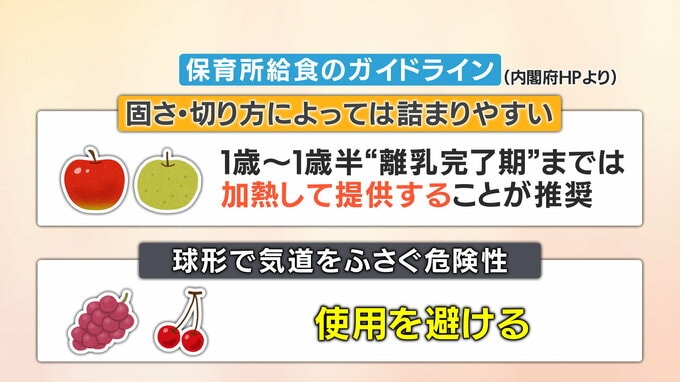 国が示す保育所の給食に関するガイドラインでは、果物のうち、リンゴやナシは「固さや切り方によっては詰まりやすい食材」とされていて、1~1歳半くらいのいわゆる「離乳完了期」までは「加熱して提供する」ことが推奨されています。また、ブドウ、サクランボは形がまるく気道をふさぐ危険性があることから、使用を避けるよう求めています。