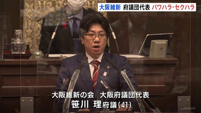 大阪維新の会で府議団代表を務める男性議員が、後輩の女性議員にパワハラやセクハラ行為などを行ったとして代表を辞任しました。大阪維新の会で大阪府議団代表の笹川理府議(41)は8年前、維新の会所属の大阪市議…