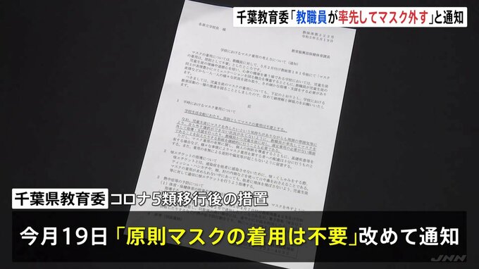 千葉県教育委員会は、学校でのマスク着用について、教職員が率先してマスクを外して指導することなどを盛り込んだ通知を出しました。千葉県教育委員会は、コロナの5類移行後の措置として、学校では「マスクの着用…