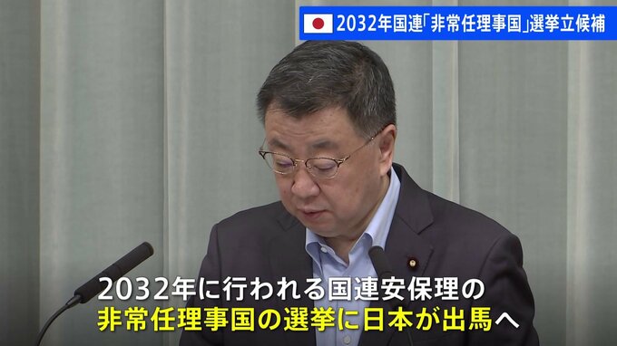 松野官房長官は、2032年に行われる国連安全保障理事会の非常任理事国選挙に、日本が立候補したと明らかにしました。松野官房長官「今月16日、我が国として2032年の安保理非常任理事国選挙への立候補を国連の手続き…