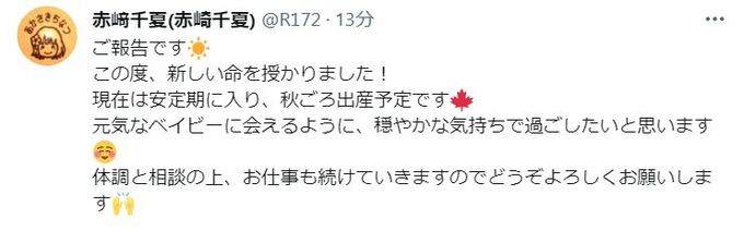 赤﨑千夏さんは「この度、新しい命を授かりました! 現在は安定期に入り、秋ごろ出産予定です 元気なベイビーに会えるように、穏やかな気持ちで過ごしたいと思います」と、その喜びを明かしています。