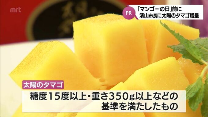 5月25日の「みやざきマンゴーの日」をPRです。宮崎市の清山市長に宮崎県産完熟マンゴーの最高級ブランド「太陽のタマゴ」が贈られました。23日は、マンゴーの生産者の代表やJA宮崎中央の職員らが宮崎市役所を訪れ…