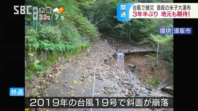アクセス道路の林道が2019年の台風19号で被災し、通行止めになっていましたが、23日、およそ3年半ぶりに開通しました。