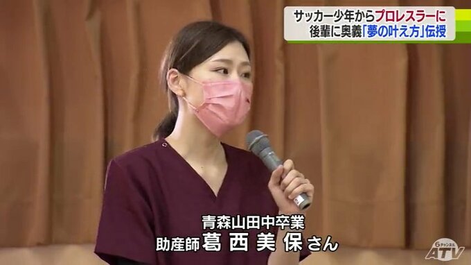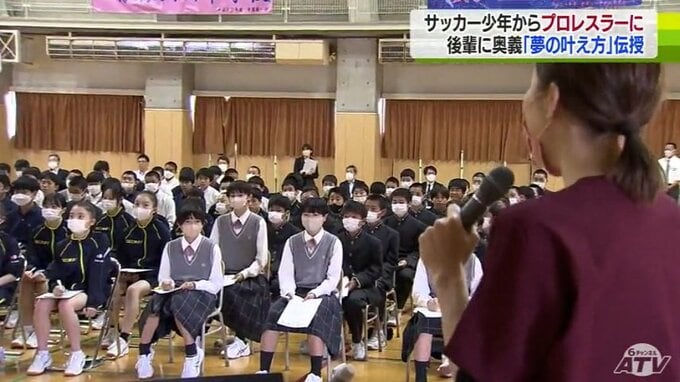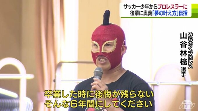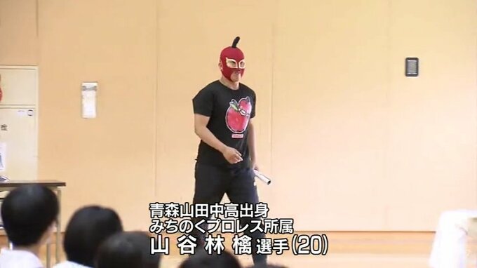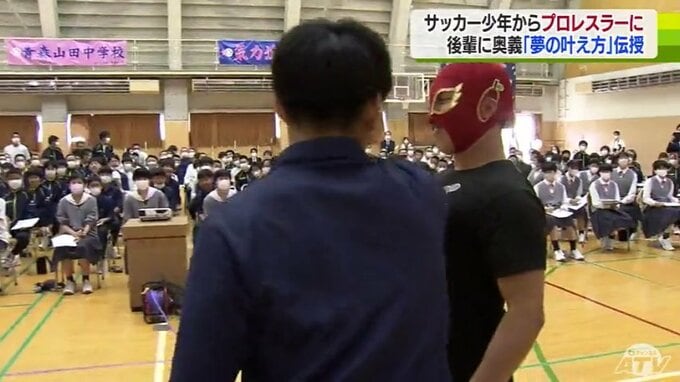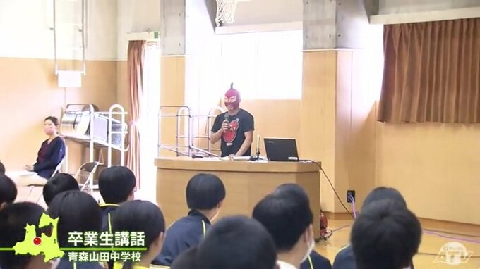 青森市の中学校に登場したのは真っ赤なマスクを被ったプロレスラーです。母校の後輩たちを前に、リングさながらの熱いトークで夢を叶える心得を伝授しました。