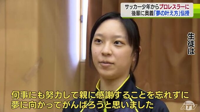 また、質問コーナーでは得意技をかけてほしいという生徒からの勇気ある要望も。山谷選手はこれに対して「逆水平チョップ」と呼ばれるプロレス技を伝授します。生徒たちはリングさながらの熱い講演で夢を叶える「奥義」を学びました。