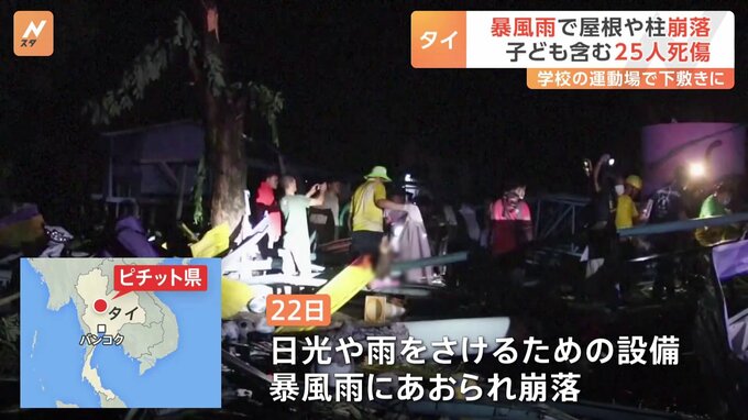 タイ北部ピチット県の学校で22日、運動場に設けられた日光や雨をさけるための設備が暴風雨にあおられ崩れ落ちました。地元メディアによりますと、6歳から13歳までの子ども4人のほか、教員や保護者ら3人が屋根や柱…