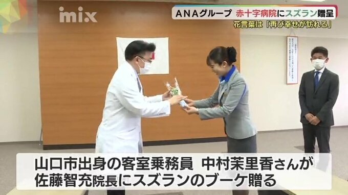スズランを贈ったのは、全日空ANAグループです。1956年から毎年、全国の赤十字病院などに届けています。病院を直接訪問できたのは4年ぶりで、山口県山陽小野田市の小野田赤十字病院では、山口市出身の客室乗務員・中村茉里香さんが、佐藤智充院長にスズランのブーケを贈りました。患者さんにはスズランの切り花50本とスズランが描かれたしおり、250枚がプレゼントされましたが、今回は直接渡すことはひかえられました。
