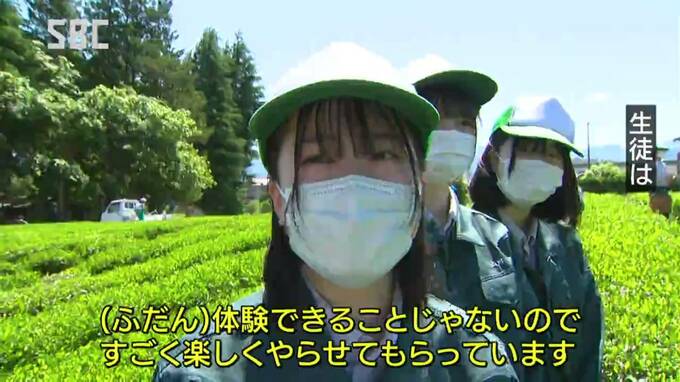 飯田市の下伊那農業高校で行われた茶摘みには、食品化学科の生徒100人余りが参加しました。