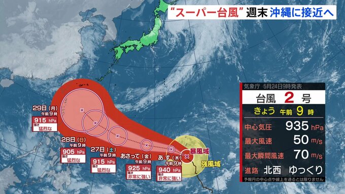 “スーパー台風”と警戒されている非常に強い台風2号がグアム付近を通過中です。現在、中心気圧は935hPa。中心付近の最大風速は50メートル。非常に強い勢力で北西にゆっくり進んでいて、週末には沖縄に近づくおそ…