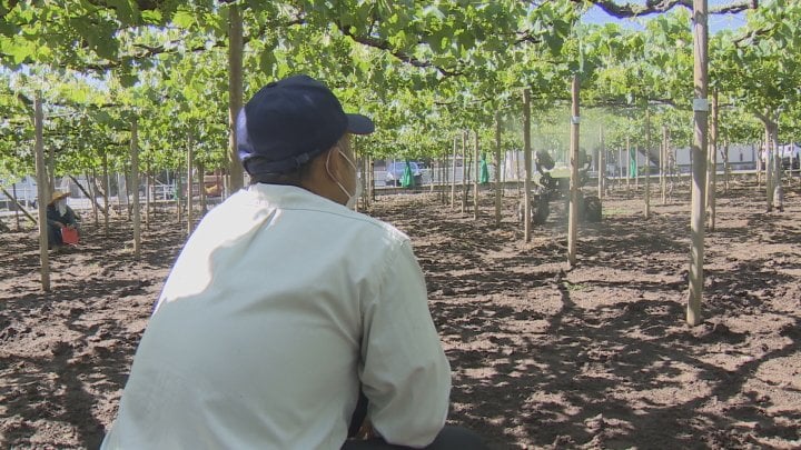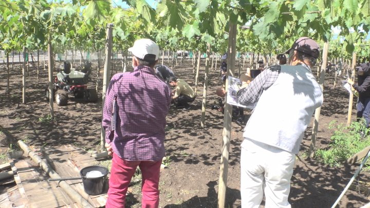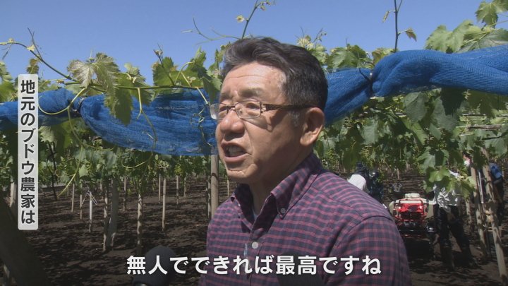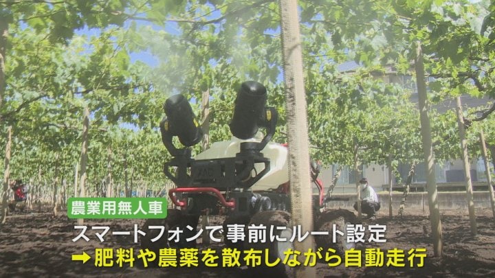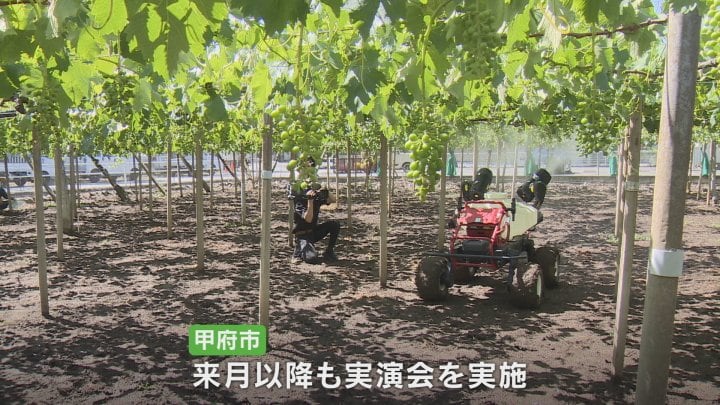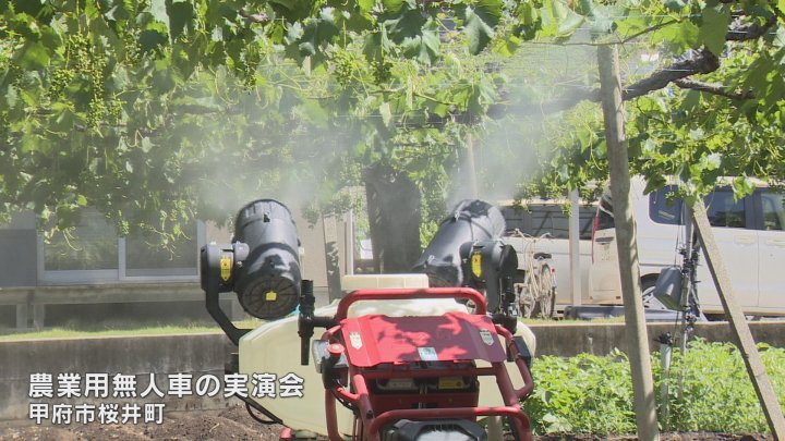 最先端の技術を使ったスマート農業の普及を目指し、無人で走行して肥料などを散布する農作業車の実演が、甲府市のブドウ畑で行われました。