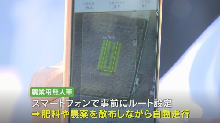 無人車はスマートフォンで事前に走行ルートなどを設定すると、液体の肥料や農薬を散布しながら自動で走行します。