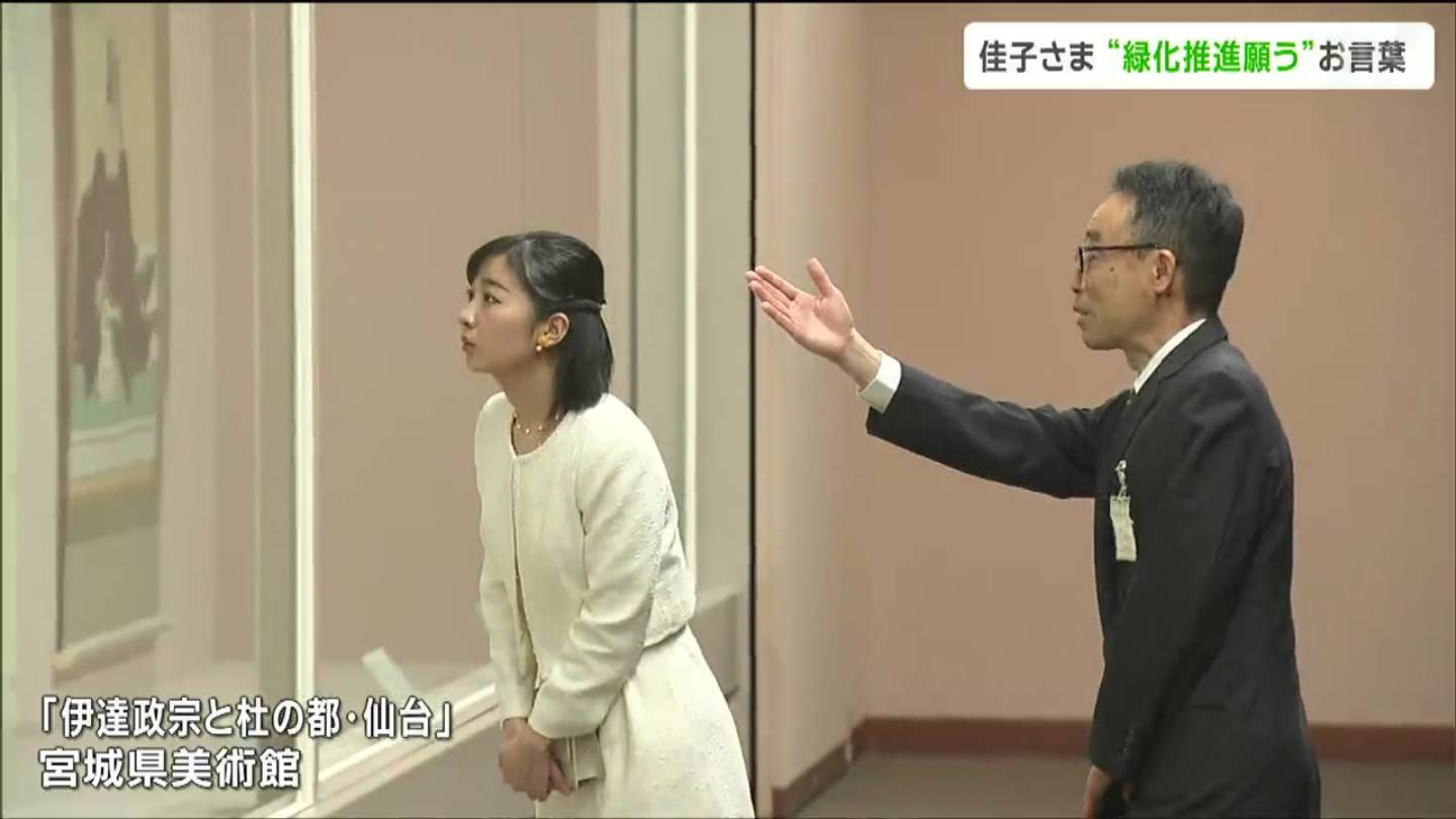 そして、会場を後にした佳子さまは、宮城県美術館を訪れ、都市緑化フェアにあわせ開かれた杜の都の変遷を紹介する展覧会を観覧されました。仙台城本丸にあったとされる大ぶりの花を背景に扇を描いた「扇面図屏風」の前に立ち止まり、興味深くご覧になっていました。