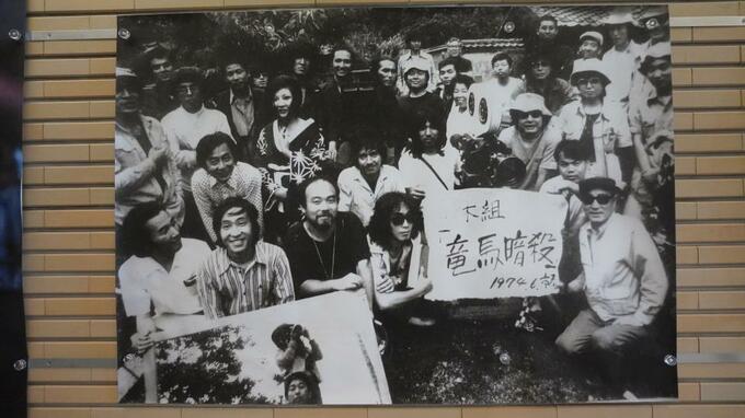 佐々木)その後もいろいろあって、「ゴールデンゲート」というお店をやっていた頃、映画「竜馬暗殺」のスチールカメラマンをやることになった。原田芳雄や松田優作が出てた映画ね。その撮影現場はすさまじいもので、監督や俳優が毎日けんかしながら撮ってる。私は心配で心配でいたら、ある日、松田優作が「ミッちゃん、心配しないで帰って寝なさい」と言って、私の頭をなでなでしてくれたこともあったの。この写真は打ち上げの記念写真で、監督が私に「本人も!本人も!」と言ったので、大きな鏡を持ってもらって撮影したの。左下に私もカメラを持って写ってる。