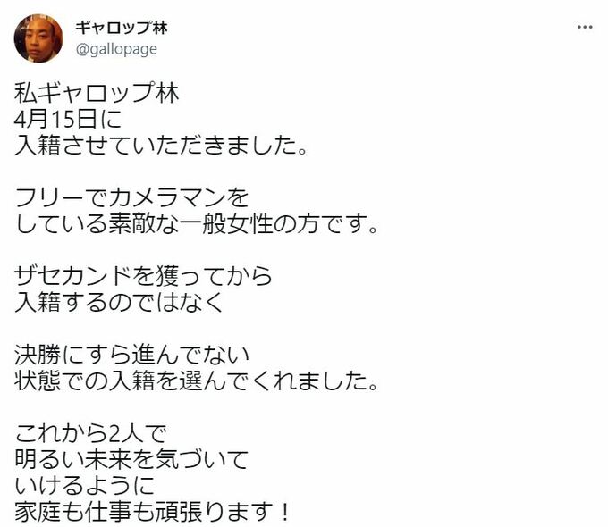 ツイッターで林さんは「私ギャロップ林 4月15日に入籍させていただきました」と切り出し、お相手について「フリーでカメラマンをしている素敵な一般女性の方です」と知らせています。