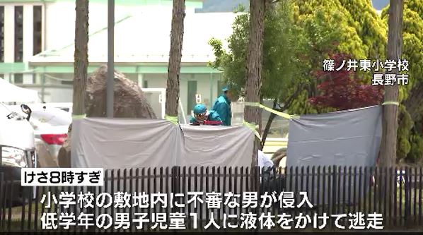 警察や消防によりますとけさ8時すぎ、長野市篠ノ井東福寺の篠ノ井東小学校の敷地内に不審な男が侵入し、校舎の外にいた低学年の男子児童1人に液体をかけ逃走しました。