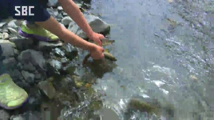 近くを流れる木曽川の支流の八沢川(やさわがわ)に移動すると、さっそく放流に挑戦。