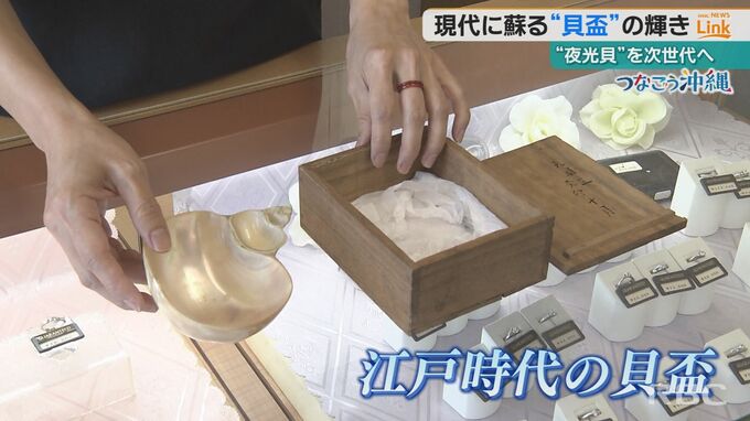 柔らかな曲線の中で、虹色に輝く真珠層。光の角度で様々な表情を見せるこの器は、夜光貝でできた盃・貝盃です。いつの時代からか人々の生活から姿を消した貝盃を、現代に蘇らせた女性がいます。