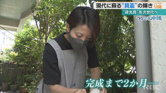 當眞清乃さん。うるま市で夜光貝を使った器やインテリアを制作しています。すべて手作業で、1つの作品が完成するまでおよそ2か月、貝を磨き続けます。