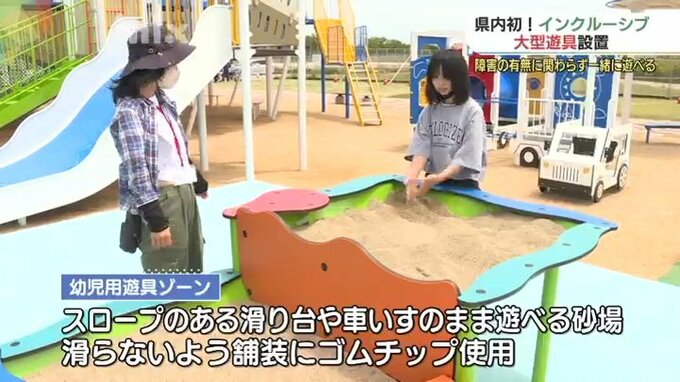 「幼児用遊具ゾーン」は、スロープのある滑り台や車いすのまま遊べる砂場をはじめ、滑らないよう舗装にゴムチップが使用されるなど遊具は、障害のあるないに関わらず遊べるデザインを取り入れています。