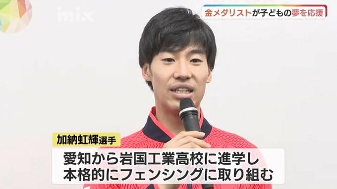 東京オリンピック男子エペ団体金メダリスト・加納虹輝選手:「僕自身、高校3年間この岩国で夢に向かって取り組んでいたときのことを思い出しますし、岩国から自分の夢をかなえられる子どもが、1人でも多く出てくれればと思ってます」