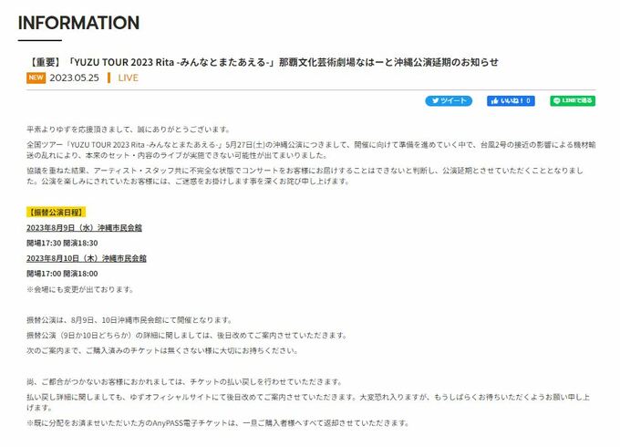 発表によると『全国ツアー「YUZU TOUR 2023 Rita -みんなとまたあえる-」5月27日(土)の沖縄公演につきまして、開催に向けて準備を進めていく中で、台風2号の接近の影響による機材輸送の乱れにより、本来のセット・内容のライブが実施できない可能性が出てまいりました。』と、台風接近による影響を説明。「協議を重ねた結果、アーティスト・スタッフ共に不完全な状態でコンサートをお客様にお届けすることはできないと判断し、公演延期とさせていただくこととなりました。」と延期決定に至った経緯を報告しました。