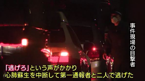 「散弾銃持って、後ろを通っていった。銃を持っているのを見た。パトカーが来てそのパトカーに向かって撃った。『逃げろ』という声がかかったので蘇生を中断して第1通報者と2人で逃げた」