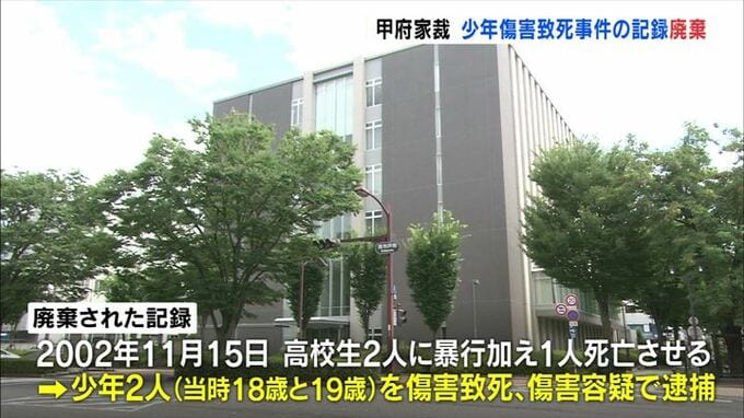 調査報告書によりますと廃棄されていた記録は2002年11月15日、駐車場で高校生2人に殴る蹴るの暴行を加え1人を死亡させたとして旧塩山市の当時18歳と19歳の少年2人が傷害致死と傷害の疑いで逮捕された事件です。