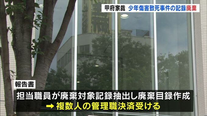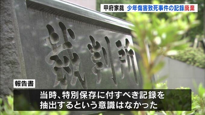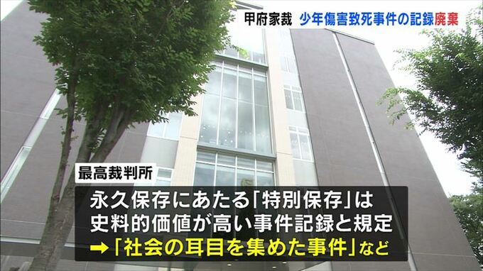 本来、永久保存とするべき重大少年事件の裁判記録が廃棄されていた問題を巡り最高裁判所が公表した調査報告書で、甲府家庭裁判所が2002年に旧塩山市の少年が不定期刑の判決を受けた傷害致死事件の記録を廃棄していたことが明らかになりました。
