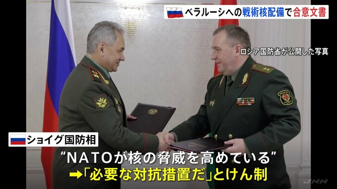 ウクライナに隣接するベラルーシ領内への戦術核兵器の配備に向け、ロシア国防省は、ベラルーシと合意文書を交わしたと発表しました。25日、ベラルーシのフレニン国防相と会談したロシアのショイグ国防相は、ベラル…