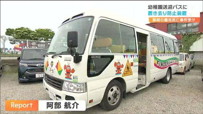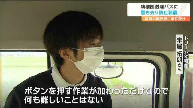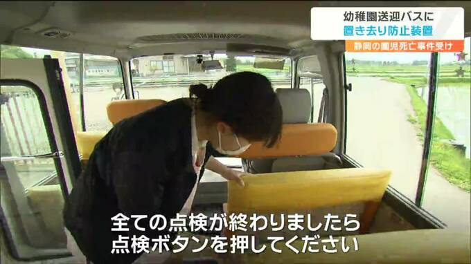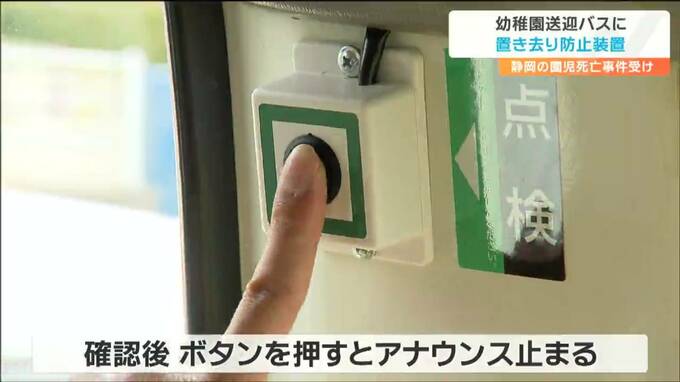 今回送迎バスに設置されたのは、園児の置き去りを防止するための装置です。去年、静岡県牧之原市のこども園の送迎バスで園児が置き去りにされ熱中症で死亡した事件を受け、国が、幼稚園や保育所の送迎バスに今年度中の設置を義務付けています。ボタンを押さずに放置していると…。