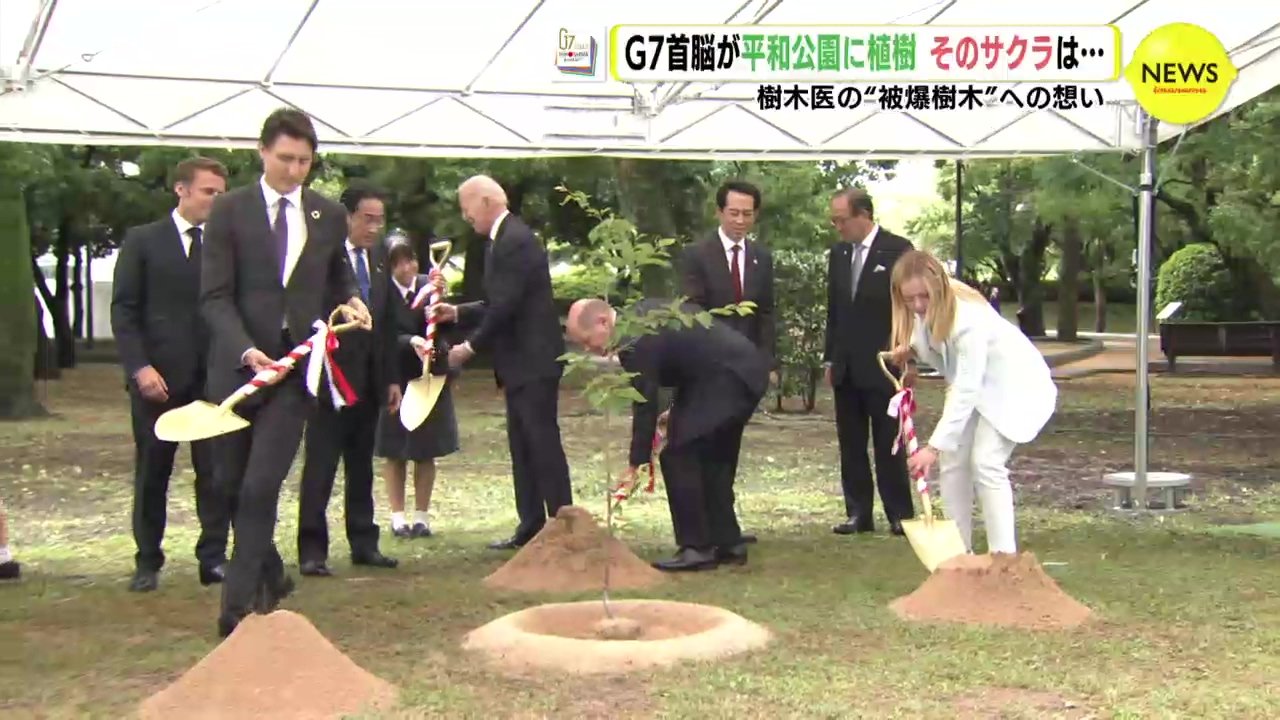 そして、サミット初日―。平和公園を訪れて、原爆慰霊碑に献花を終えた首脳たちは、そのまま平和公園西側の植樹スペースへ。真っ直ぐに伸びた被爆桜に、首脳が代わる代わる土を入れていきました。