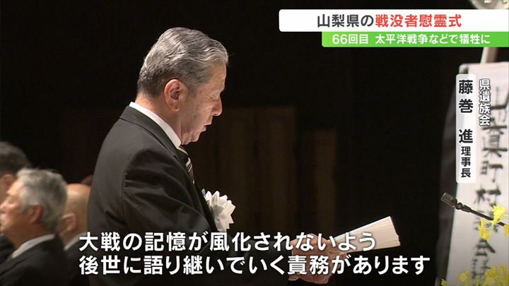そして県遺族会の藤巻進理事長が戦没者に向け「二度と戦争を繰り返さない」と語りました。