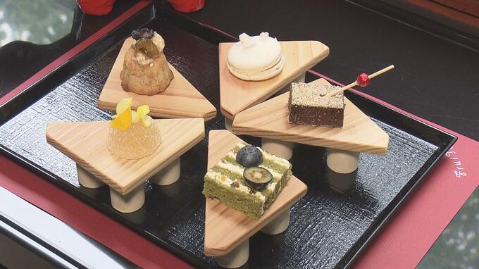 会津の縁起物「かざぐるま」をイメージした器にのったスイーツは、福島の銘菓やあんぽ柿などを洋菓子としてアレンジしたそうです。