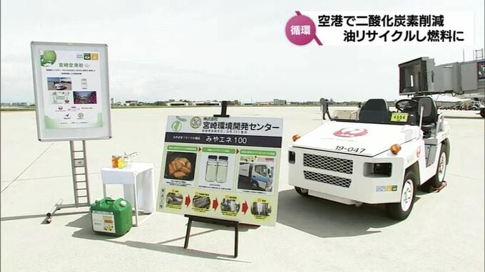 二酸化炭素排出量を削減するための、空港での取り組みです。日本航空は、宮崎空港で使用している作業用の車両にバイオディーゼル燃料を使う実証実験を始めました。日本航空が、5月22日から宮崎空港で始めた実証実…