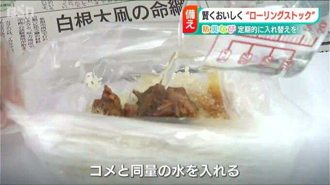 まず、ポリ袋の中にコメを入れます。次に、サンマ缶を3等分していき、3分の1をコメの上に乗せます。そしてコメと同量の水を入れます。
