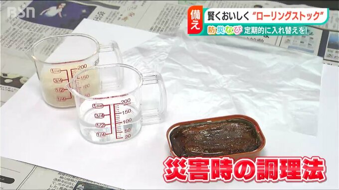 用意するのはサンマの缶詰に水とコメ。そしてポリ袋です。ポリ袋は耐熱性のあるものを使ってください。